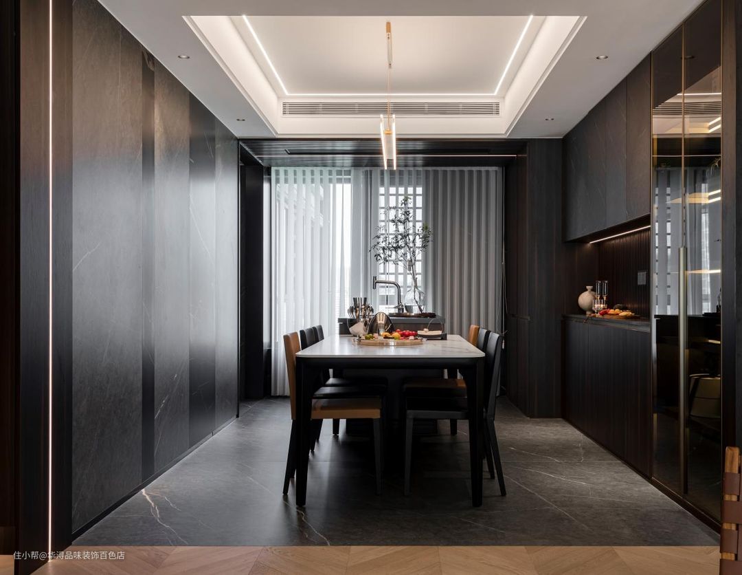 右边有一个黑色与玻璃结合的餐边柜,玻璃柜里面放着各种美酒,满足了业主对美酒的品味。餐厅顶部还悬挂着一个精致的吊灯,为整个空间增添了一些独特的氛围。