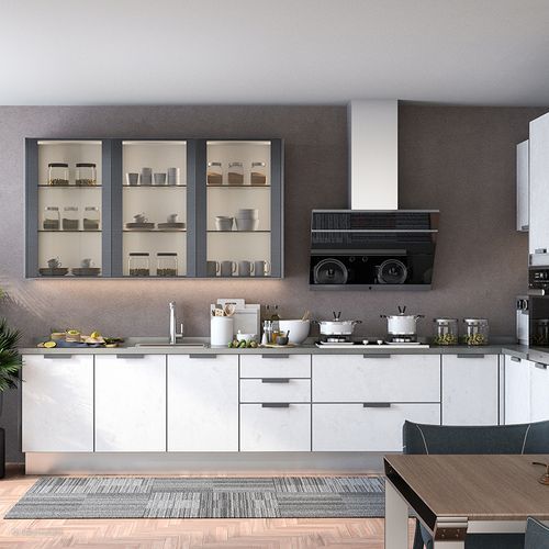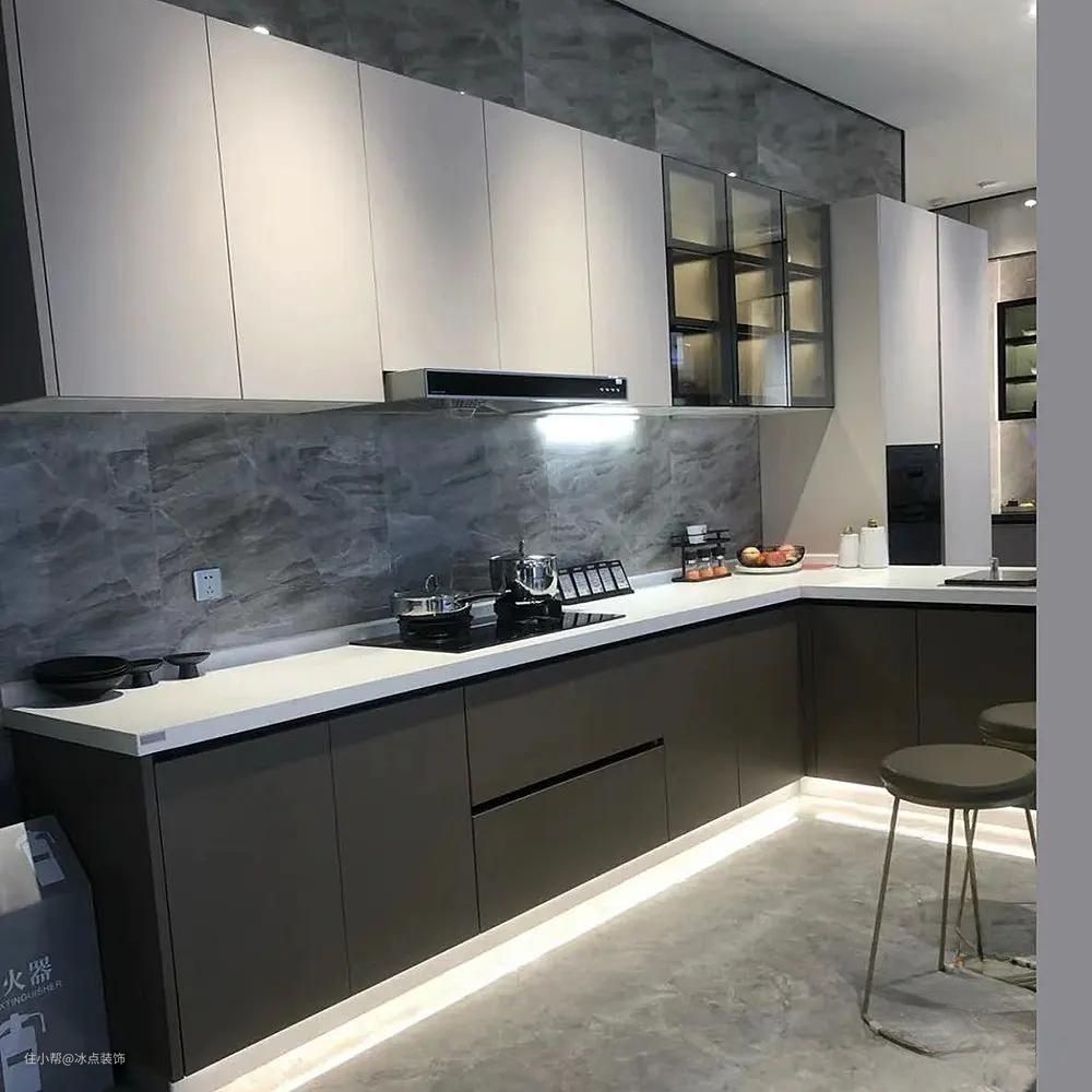1、开放式橱柜:适合大型户型,免拉柜门设计方便物品拿取,玻璃门的设计打造出高级感