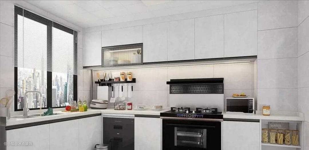 3.L型橱柜:地柜和悬空式橱柜的设计,倚墙而设户型局限小,不规则布局设计感强,黑色元素点缀更增加层次感。