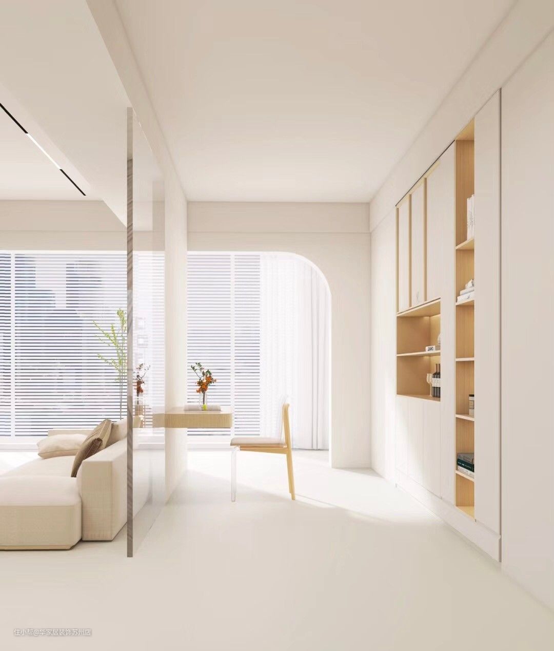 - 沙发不靠墙,留出1.5m左右空间,利用墙体+透明玻璃做隔断,打造出一个开放式书房。