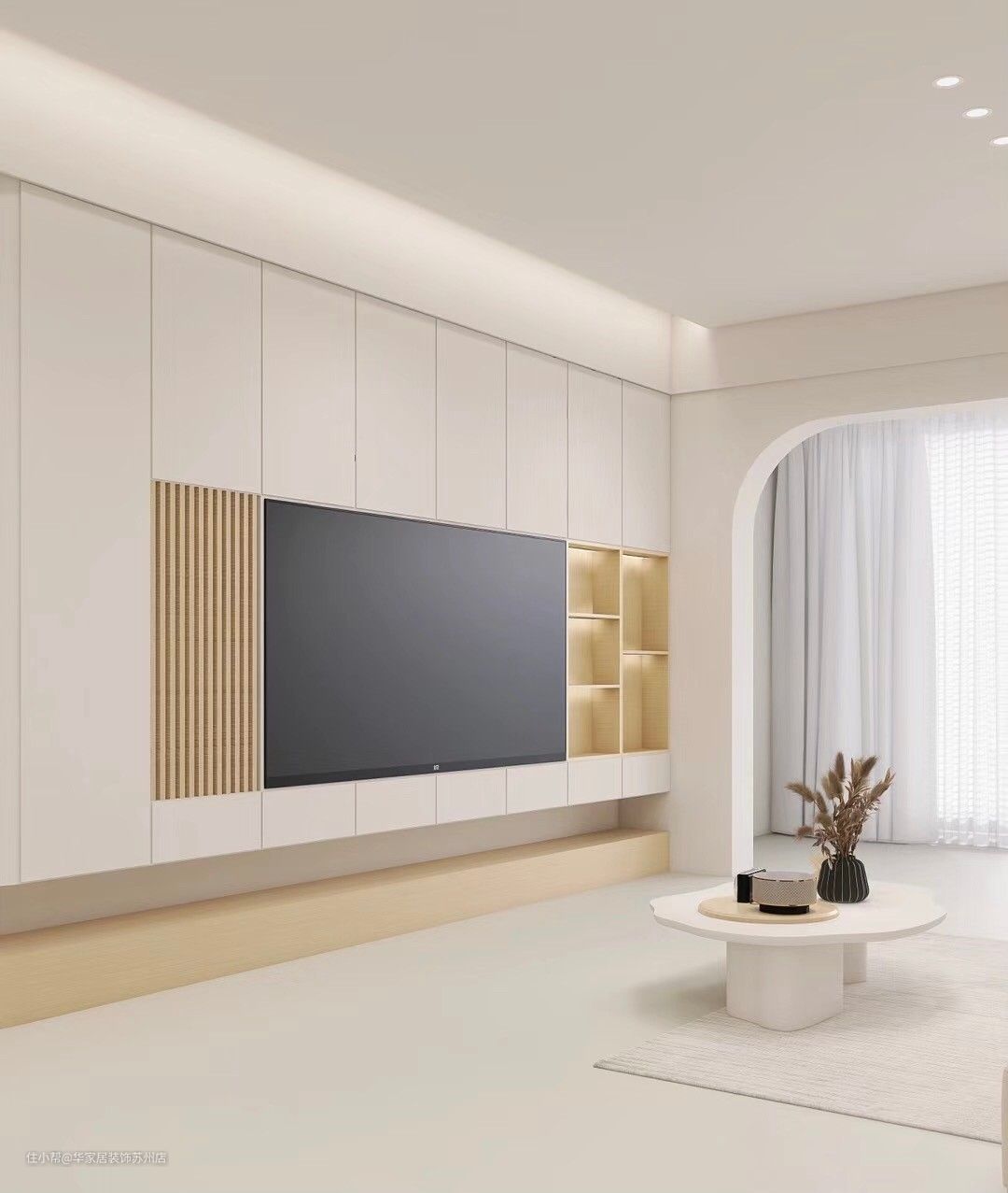 - 悬空的电视柜既方便打扫卫生,又有丰富的储物空间。治愈的白色柜门,超高门无拉手设计开启你的极简生活!