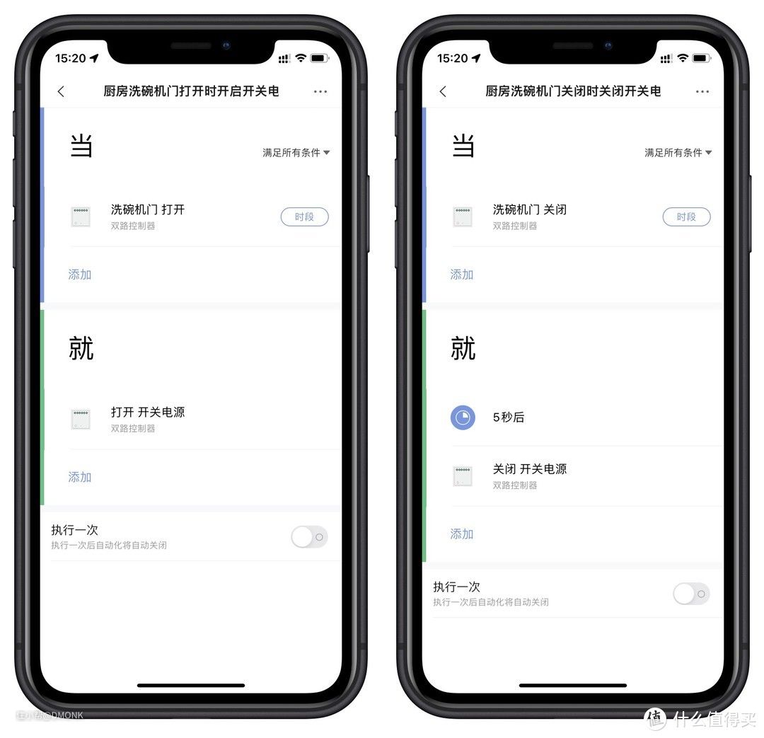先设置两个自动化,当洗碗机门打开时把开关电源也打开,洗碗机门关闭时开关电源延时断电。