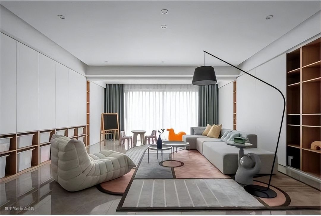 如果说是设计成儿童游乐区,那就可以将客厅变成一个集游乐、学习、休闲于一体的多功能空间,日常放下手机,多与小孩子在在同一空间内产生更多的互动与交流,让孩子感知到陪伴的温暖,让一家人变得其乐融融。