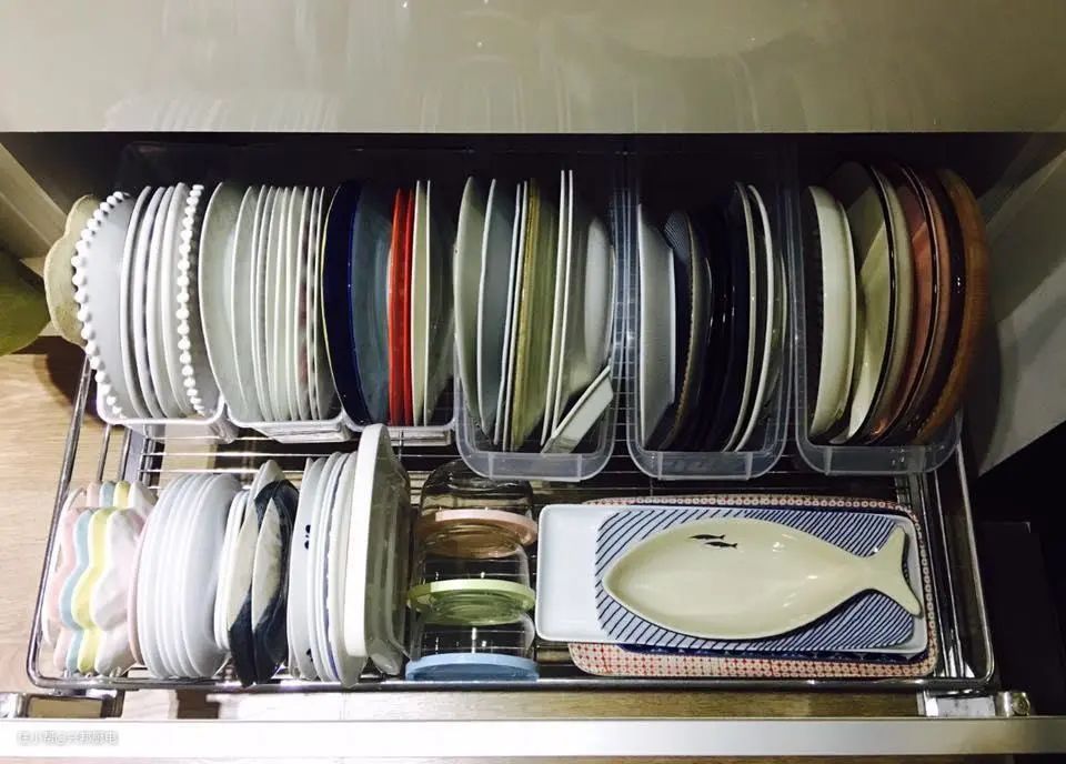 厨房里的碗、盘子和汤勺等各种类型的餐具,由于种类较多,收纳不方便,我们可以换一种思维方式,利用碗架来收纳碗碟,让碗不再摇摇欲坠,安全方便拿取。
