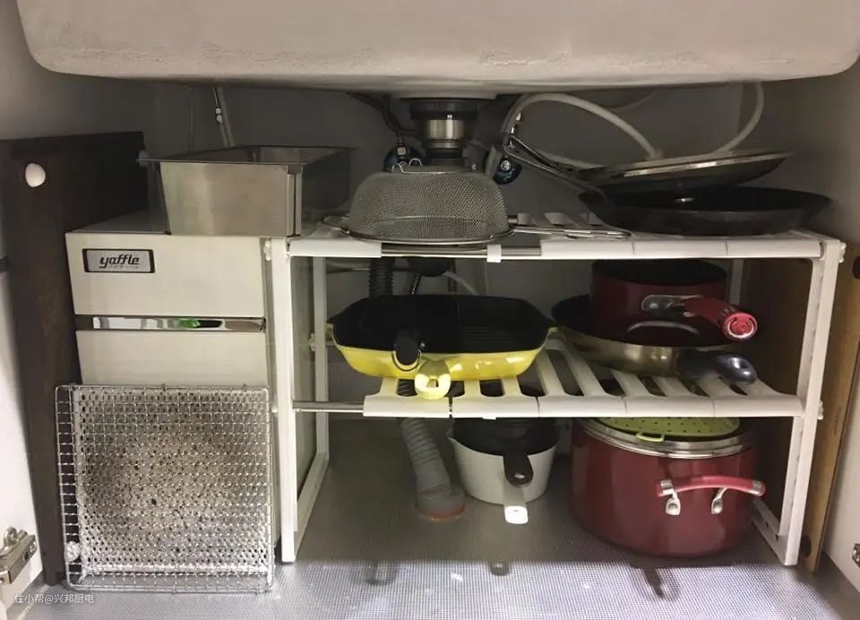 水槽下、油烟机上,用收纳架,竟然还可以收这么多,水槽下使用收纳架,用来放置常用的锅具,可以轻松做好分类和收纳。