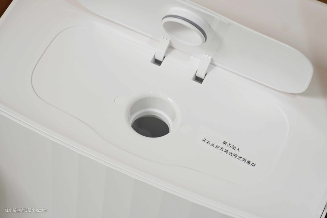 因为基站顶部无法拆卸也无需维护,所以就只在顶部设计了一个清洁液注入口,定期注入石头官方清洁液后,在清洗拖布过程中,会自动进行清洁液的添加,这和洗衣机的洗涤液自动投放有着异曲同工之妙,我们完全不需要再考虑每次该添加多少清洁液才更合适这种问题。