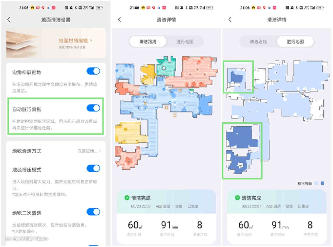 除此以外,石头PP还有一个智能复拖功能,平时我们的地板上不同区域的脏污程度肯定是不一样的,尤其是走廊和餐厅等位置,比起房间内很显然要更脏一些,石头PP会在基站清洗拖布时自动对污水的脏污程度进行检测,针对脏污程度特别高的区域进行智能复拖,从而保证清扫完成后室内各个区域都处于非常洁净的状态。