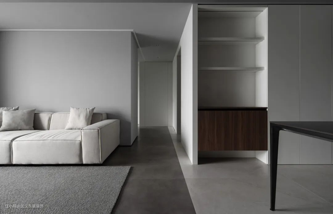 如果你还是觉得单调,我们可以用第二点技巧,“跳色法”,比如浅色的空间直接搭配一个黑色的沙发来一个大反差,增加整体的质感。