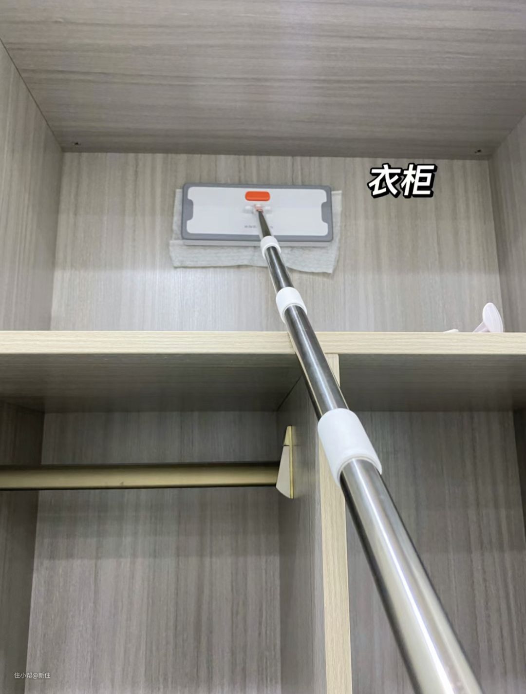 当然,太费力气的事情谁也不想干,我都是用平板拖把夹上静电除尘纸,巧用平板拖的伸缩杆和可旋转拖把头,清理柜子顶部、柜门、柜内格子连凳子都不用踩的。