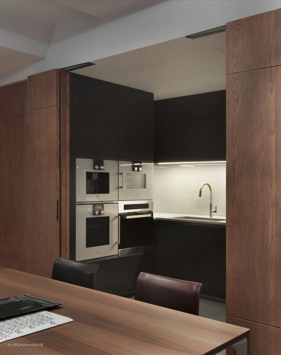 开放式餐厅则与中岛结合,将内厨空间纳入隐藏门,吻合屋主日常的使用习惯。书房位于厨房旁侧,从透明拉门进入后,其中的弧形规划具有包覆性的安全感,其中的开放柜位则于背板贴上亮面石材,各材质相互对话交织家的独特语汇。