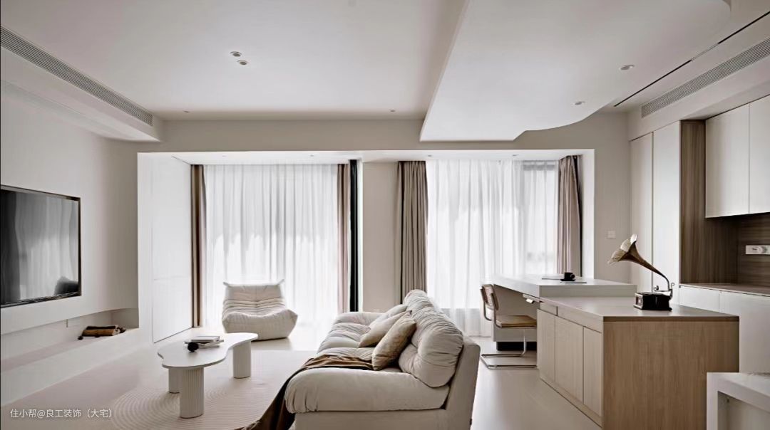 浅色的美拉德风格,以卡其色、杏色为主色调,搭配乳白色墙面,空间显得更有层次,明亮又温柔。