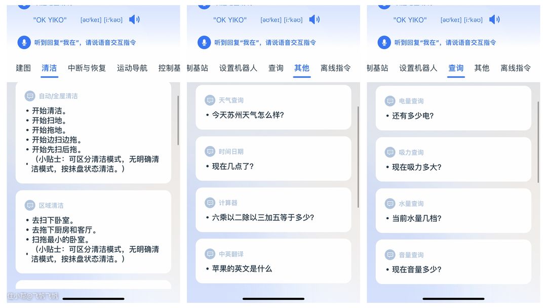 三是可用命令很多,常规的打扫清洁以外,还能用来询问天气、乘法、翻译等互动,是个小智能机器人。