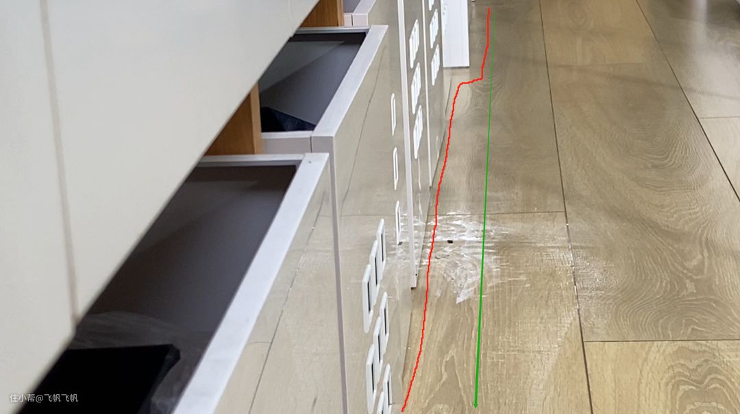 为了测试贴边,常规的一条直线不够考验它的水平,用这段造型略特殊的柜子底部储物格子做示范,以往测试的扫地机器人大多是走绿色的直线,没有能照顾到弯曲的路线(红色)。