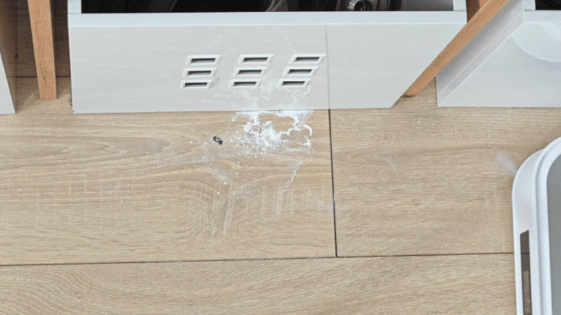 而X2在过了凸起位置后,会再往缩进去的位置推进,再摆正机身进行清扫,而在摆正机身的过程中,持续对边缘位置使用特别的脚步进行清扫,把面粉基本清理干净了。