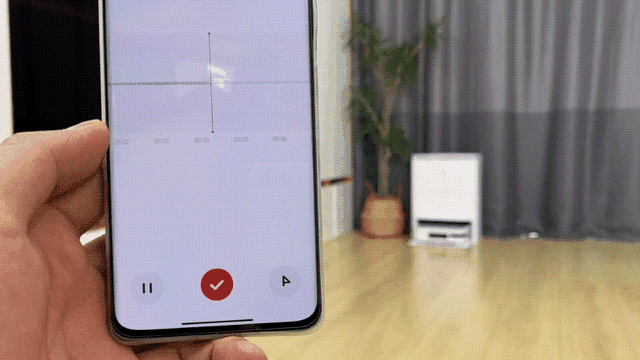 一个是呼叫敏感度很高,在客厅的大空间里随便一喊她就会听到。大家注意看上图手机上的声音波形图,可以发现我的声音并不大,距离我五六米的YIKO听到并给出了回应,它的声音波形图也在上面显示了,两个波形图对比可见我只是正常说话的声音。