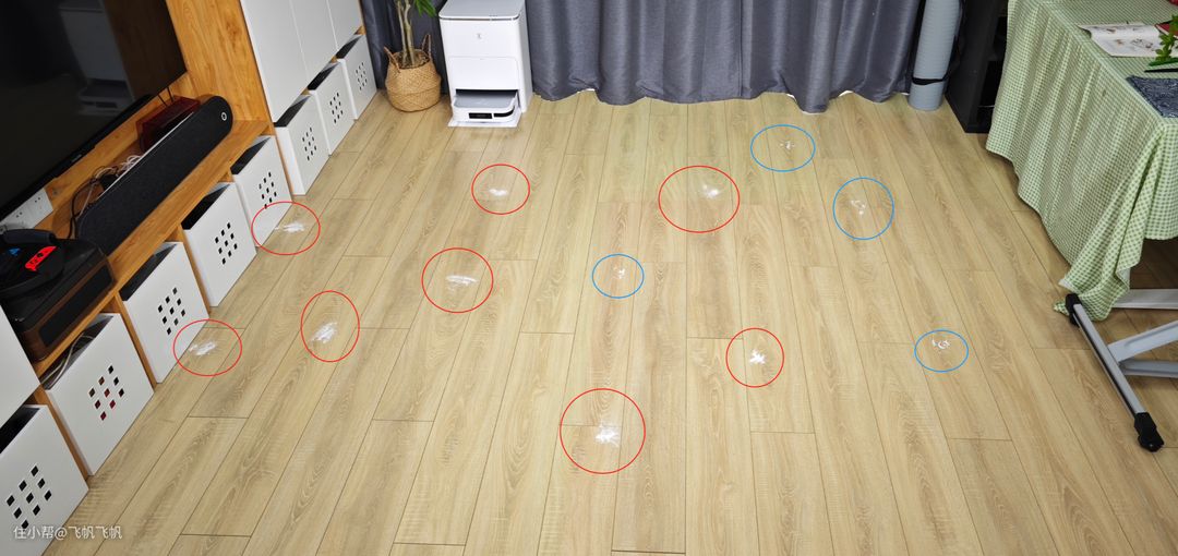 而整体算法的改善,也体现在99.77%的单位面积覆盖率上。在年初“20系”的横评里面,各家旗舰在这个客厅多处垃圾测试下都会有遗漏。而这次在同样的环境设置下,我给X2放置了更多的面粉(红)与纸屑(蓝)两种垃圾来测试。