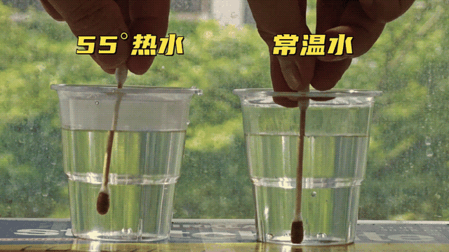 先讲热水洗,我们上两个对比,第一个是棉签沾满了老抽,在两种温度的水里静止3分钟,热水的棉签已经快全白了,而常温还有较多的酱油在上面。