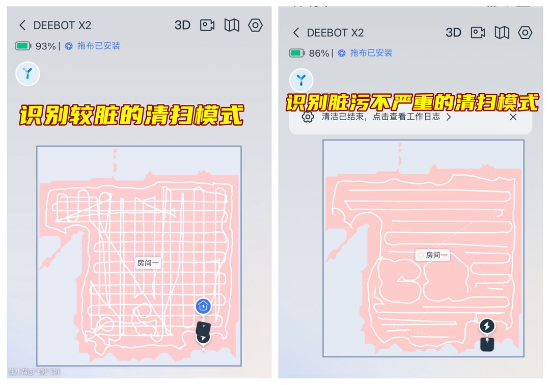 我把这次测试与后面的几次清扫记录做了对比,发现X2在清扫中会进行检测,如该区域较脏,会进行交叉十字形的覆盖清扫,而在不太脏的情况下只是做一个方向的横向清扫,可见X2的AI智能度很高。