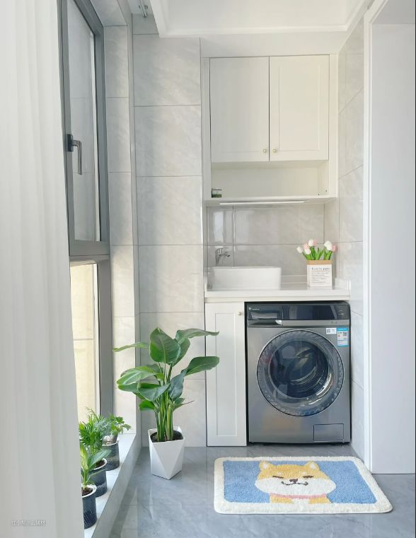 第二,阳台不建议单独放一个洗衣机,这样看着会很丑。做一个组合柜,隐藏了洗衣机,也多了一个洗手盆,还多出了一个柜子的收纳空间。