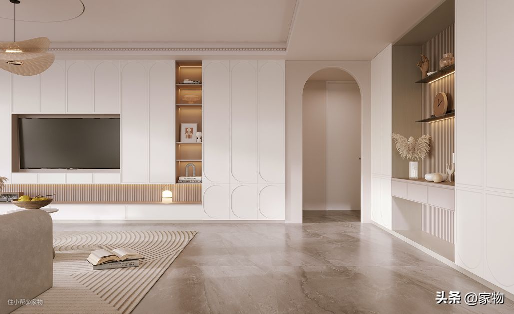 如知名家居博主@宝藏土女孩 的家,墙面PU线条和顶面石膏雕花装饰,与拱形门相呼应,搭配奶油色的沙发和地毯,再加上好莱客的杏白花色定制柜,多种元素的碰撞下营造出浓厚的奶油法式氛围。
