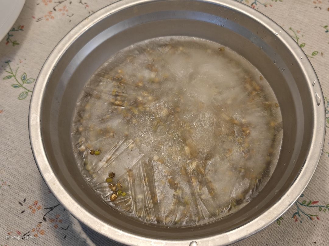 先把绿豆洗干净,用一个铁碗或是塑料碗加水放入冷冻层结冰后取出。