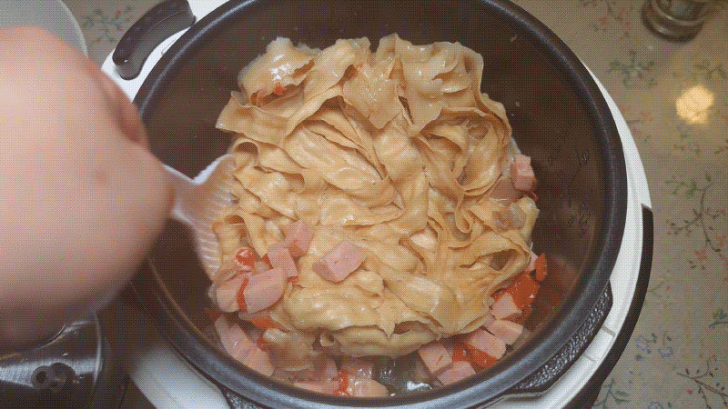 把茄子、番茄、火腿切成1-2CM小块...emmm其实别介意尺寸,随便切碎就行,放入墩墩锅后上面覆盖上手工面,尽量散开放不然面会黏,不需要放水直接开启微压模式的精煮饭,默认35分钟开启。
