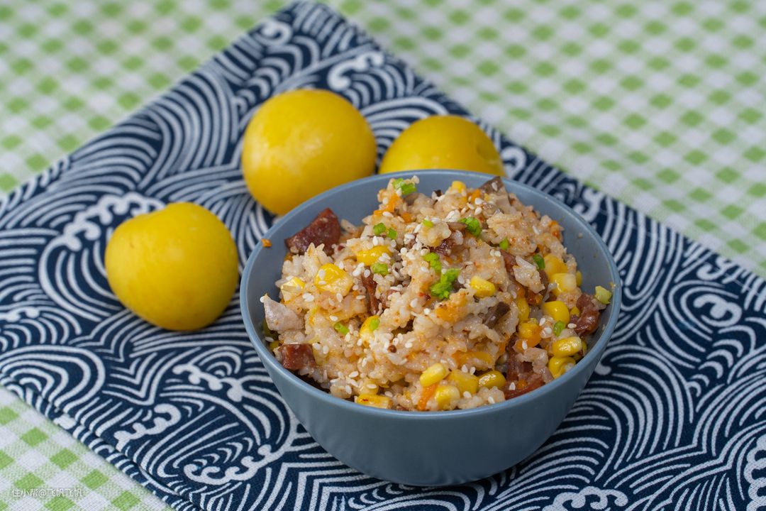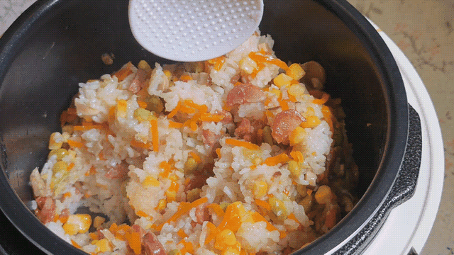 食材:豆子(毛豆、豌豆)、玉米粒、香菇、胡萝卜、腊肠、大米