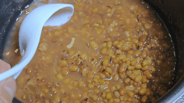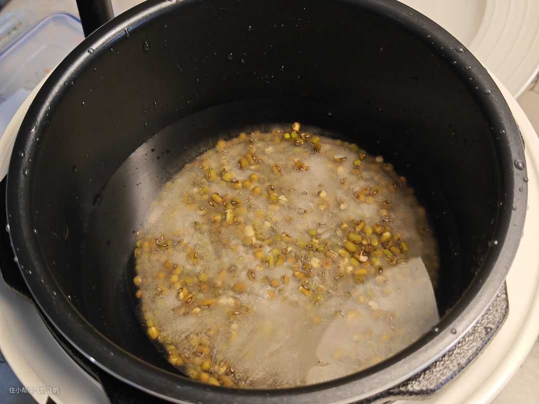所有的绿豆都爆开了,非常软糯,这时候放入冰糖搅拌,糖量建议边尝边放。