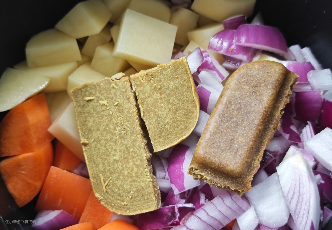 洋葱切碎,土豆红萝卜切块(1-2CM),都丢进去后放咖喱,再放水刚好没过咖喱一点点,最后放入牛腩。