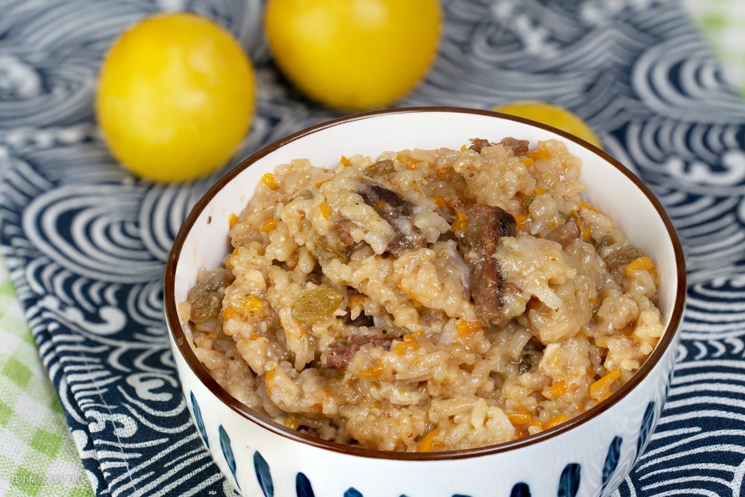 食材:大米、羊肉、胡萝卜、洋葱、葡萄干、孜然粉、大蒜。