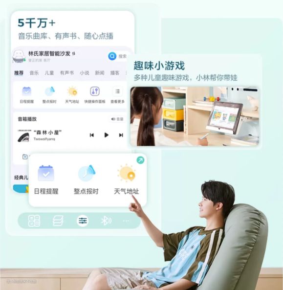 G085本身还带有其他多种功能,如听歌、趣味小游戏、天气、日程提醒、有声小说等等。这些功能汇集在一款沙发上,配合本身就宽大柔软的沙发,让人恨不得躺上一整天。