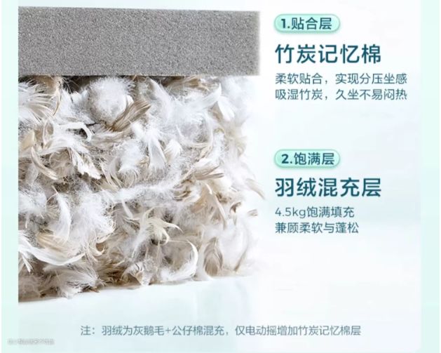 前面说了内芯采用混合灰鹅毛,而在贴合层与肌肤接触部分则是采用了竹炭记忆棉,即使坐久了也不容易担心闷热长痱子等等,吸湿排气。