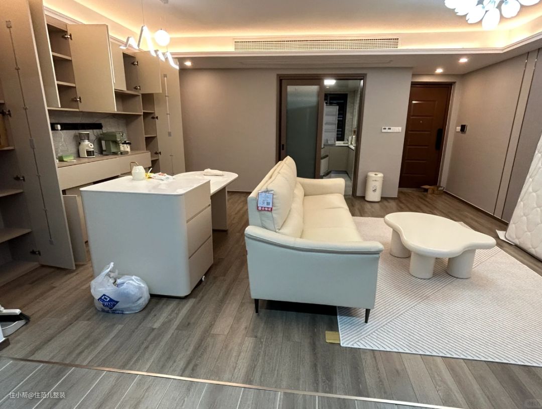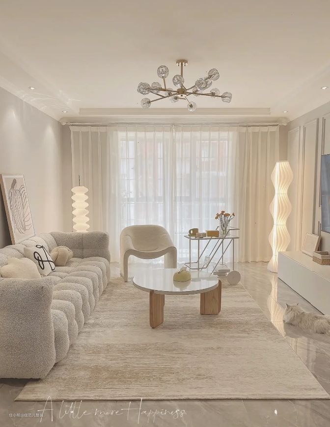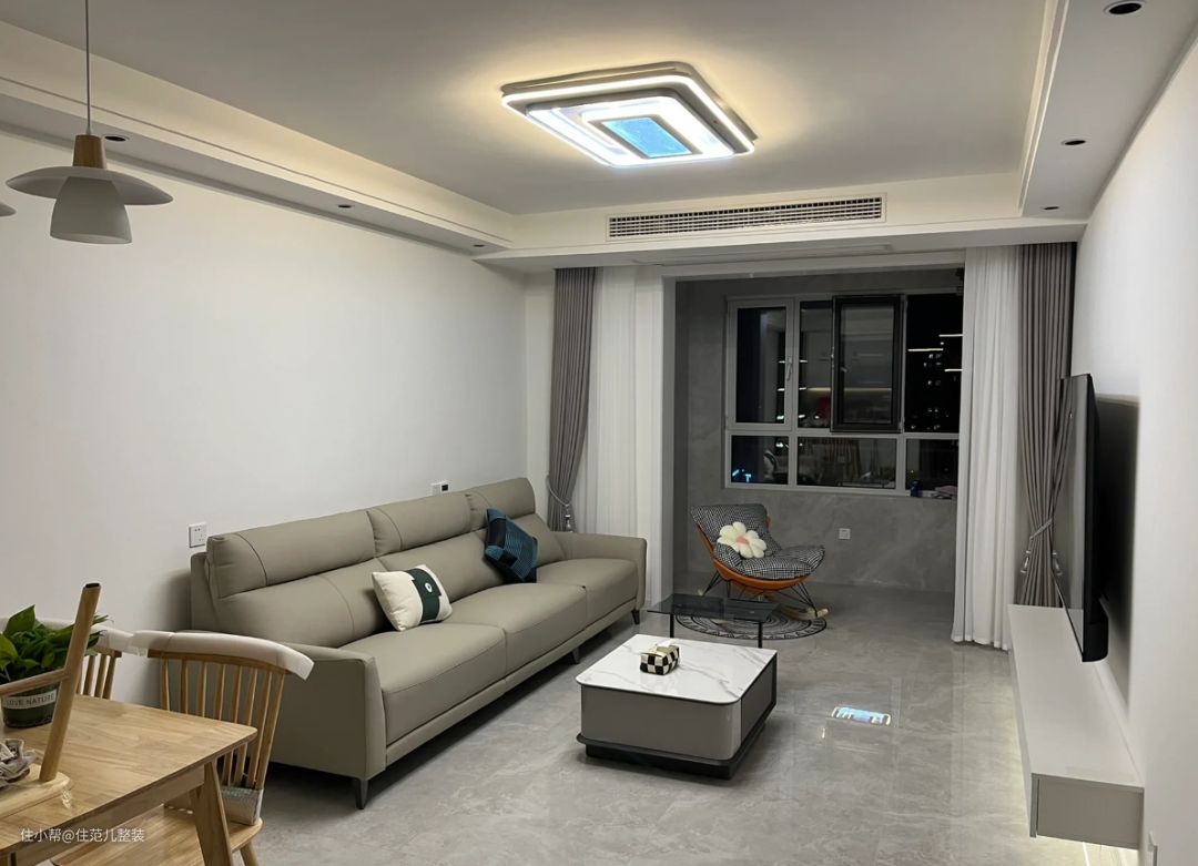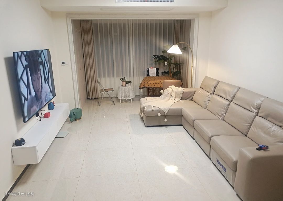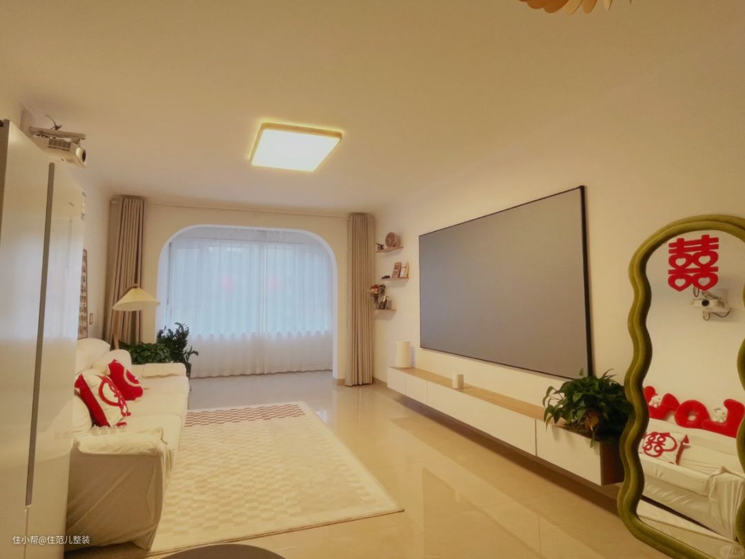如果沙发还没买,尽量选直排或弧形的布面款,避开深色亮面皮面。其他家具保持色调统一,木质浅色最佳。