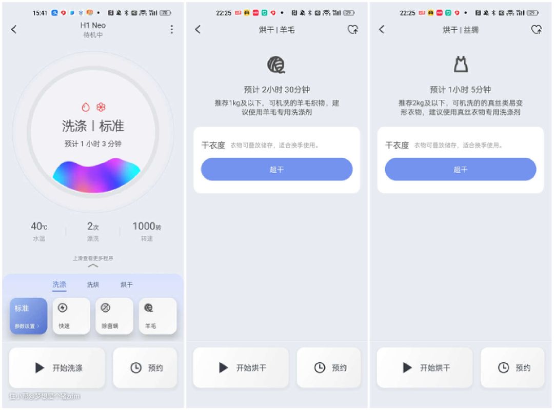 如果我们是需要烘干羊毛、真丝之类的比较娇气的面料,则可以选择羊毛或丝绸模式,此时烘干温度会保持在一个低至约45℃的状态下,这样的低温烘干,可以降低衣物损伤。