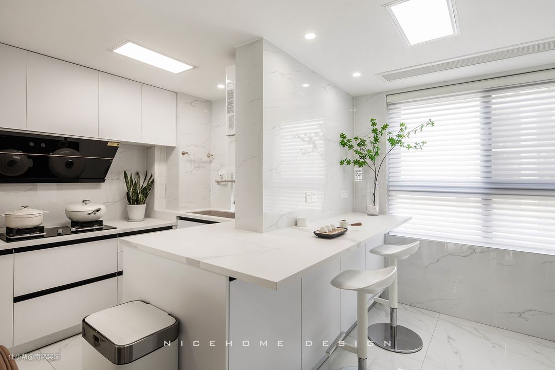 厨房的墙砖不要选鱼肚白、爵士白这种大花纹的款式,清爽白净有纹理的确很受大众的欢迎,但是这样的砖一贴上去就很难选柜子,要是选浅色柜必定踩雷。实在想用就搭配深色的柜子,这样动静平衡,才显高级感。