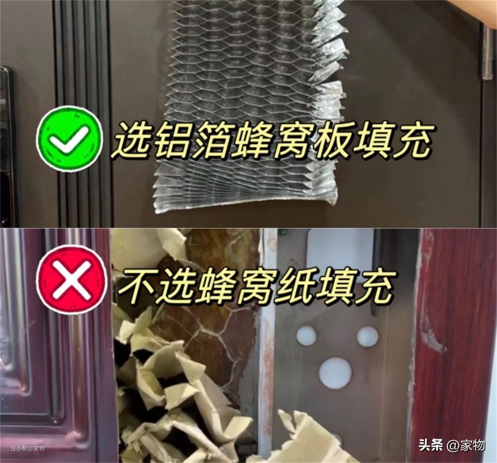 有的防盗门很轻,就是因为内部其实是由蜂窝纸板填充的,稳定性或许有一些,但安全性真是让人无语,相比之下,门内填充铝箔蜂窝板,就能大大增强安全性和耐用性,更建议这种。
