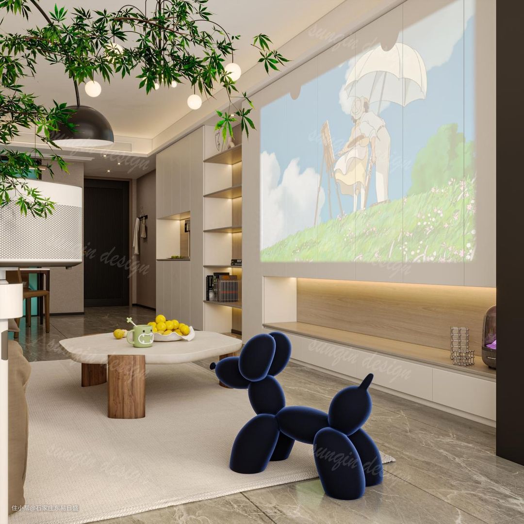 客厅地面搭配克莱因蓝饰品,可供孩子玩耍。左侧引入一抹绿植,增加空间调性,生活气息满满。