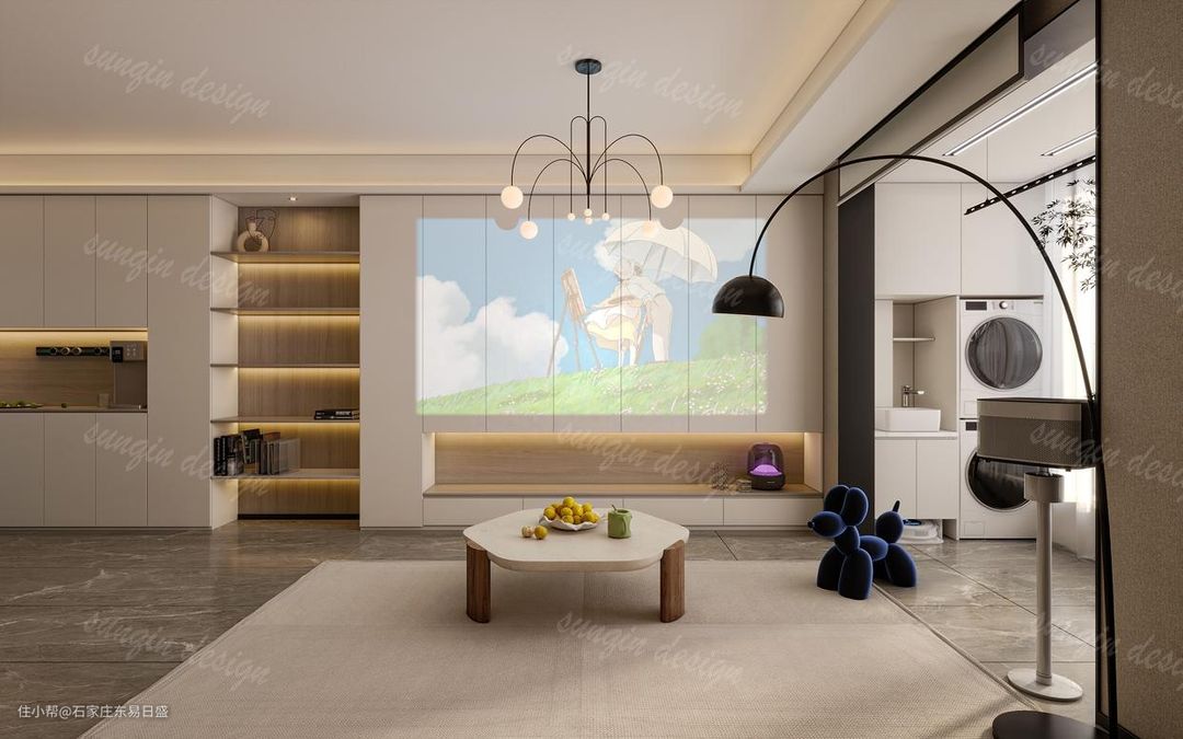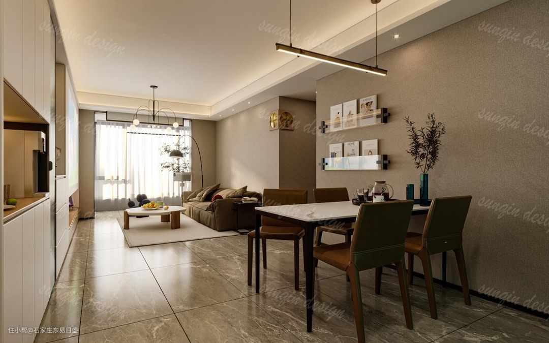 电视墙与餐边柜一体化设计,整体性更强,白色与木色的结合温馨舒适。满墙电视柜设计增加室内收纳,同时可利用柜体立面投放影片,幸福感满满。