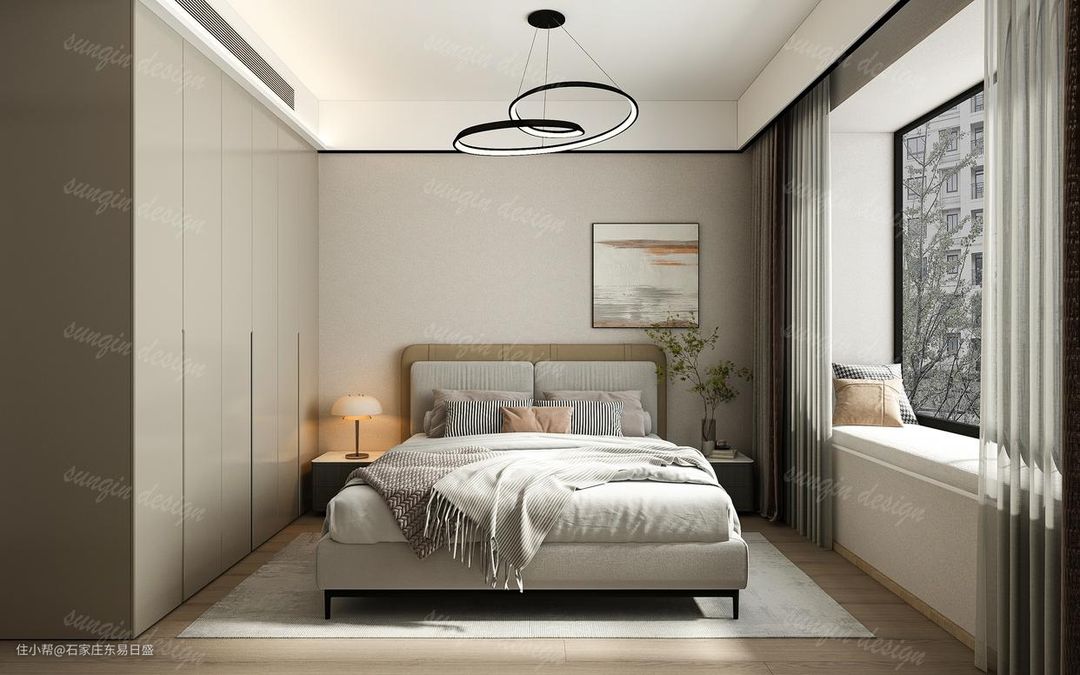 主卧以浅色为主搭配素色壁纸,顶面做单层石膏板吊顶,轻薄简洁。搭配卡其灰色调的衣柜,呼应整体调调,床品软装颜色丰富,整个空间得到升华。