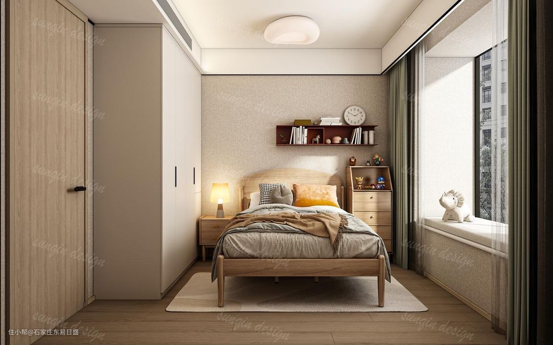 次卧以简约硬装造型搭配浅色木纹,整个屋子充斥着温馨舒适的氛围,带给业主家的感受。墙面定制一组木质开放格,美观又可收纳。