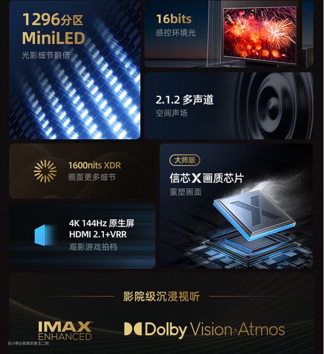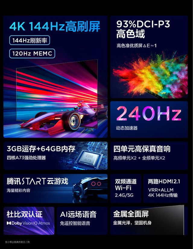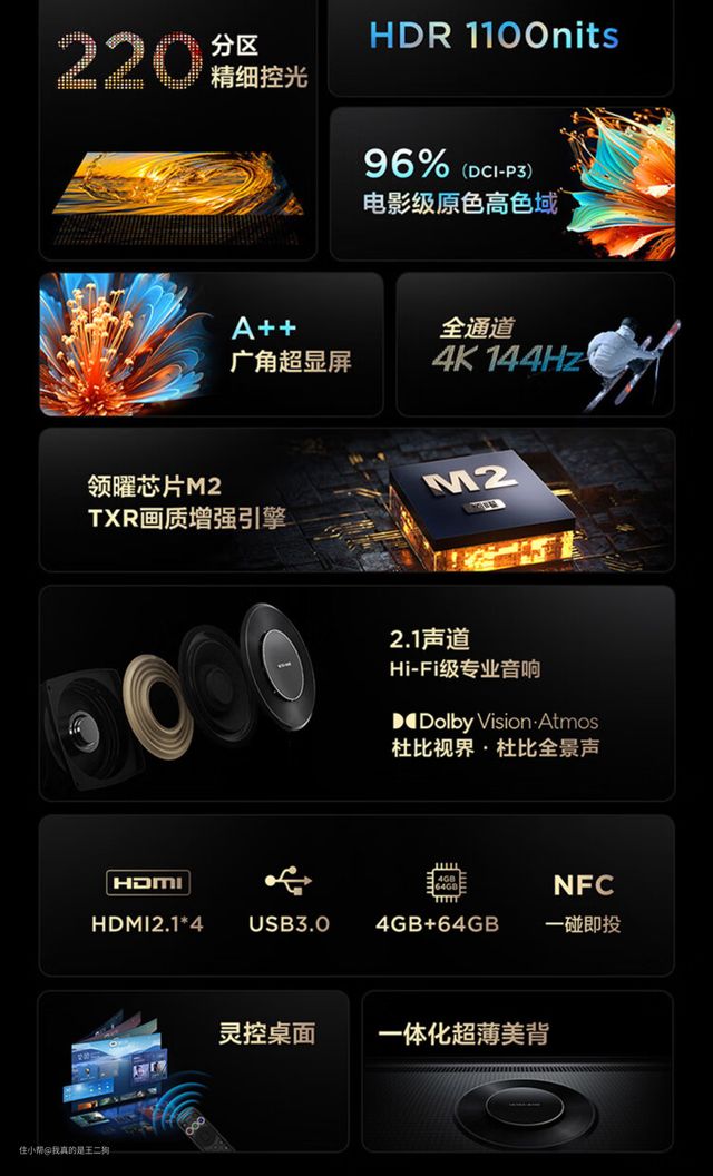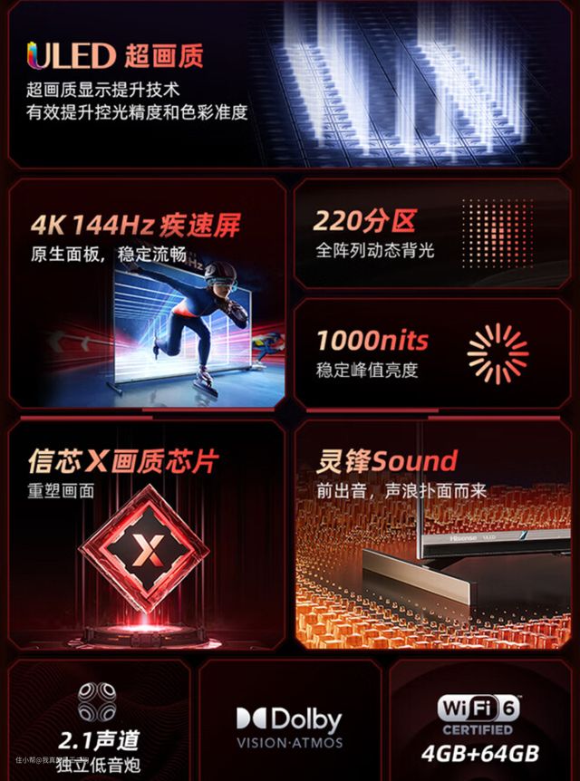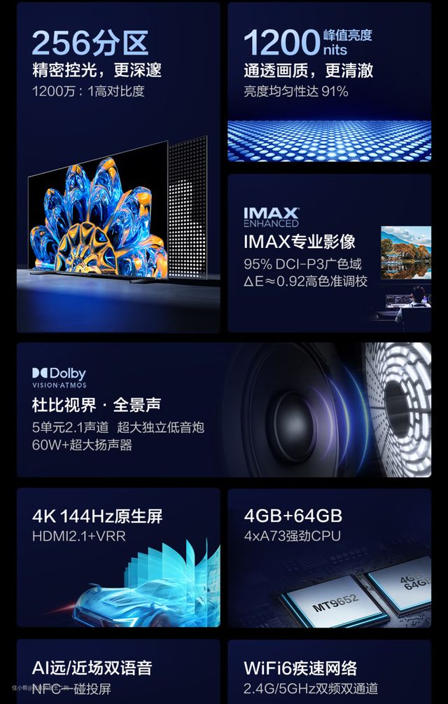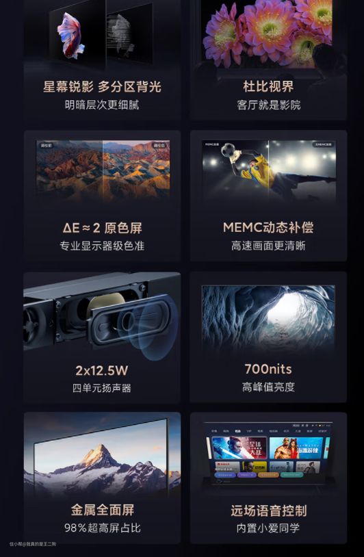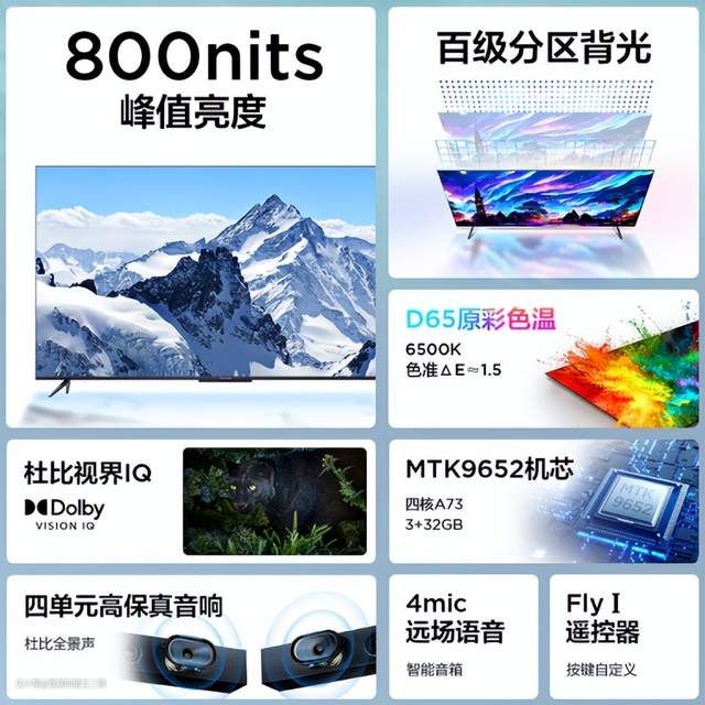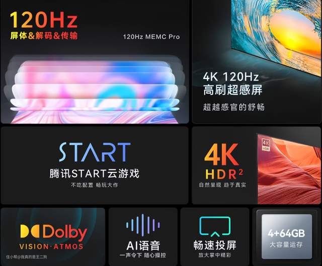 兼顾配置和性价比,可以重点关注下红米X Pro,应该是这么价位目前最值得入手的电视产品(可以说没有之一)。红米X Pro可以轻松主流的游戏和观影需求,尺寸方面包含65和75两个规格可选。四核A73芯片+3G运存、94% DCI-P3广色域、HDMI 2.1接口、700nit峰值亮度、120Hz高刷、MEMC、45个(65寸)/60个(75寸)控光分区、2*12.5W扬声器单元,整体配置还是比较不错的。不过目前尺寸仅有65和75可选,要是尺寸再丰富一些就完美了。