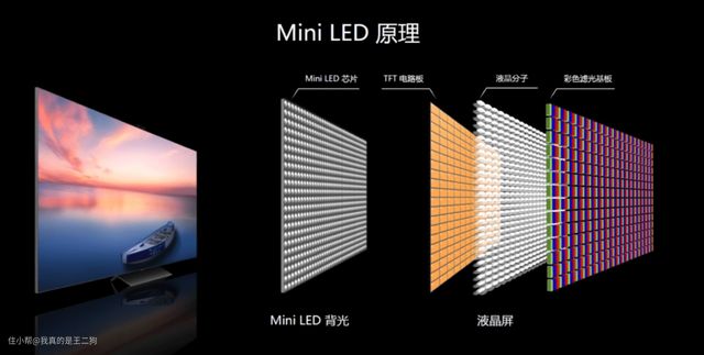 这里二狗简单说说现在大热的Mini LED电视。Mini LED作为发展Micro LED的过渡技术,目前已经相对成熟。Mini LED电视相比传统LED电视来说优势还是很明显,和OLED电视相比也各有优势。Mini LED技术上与目前小间距LED显示技术相似,但显示功能上实现了小间距LED功能拓展((灯更小同时灯组数量更多),控光效果更好(当然功耗也上去了,对硬件和软件的要求也更高)。