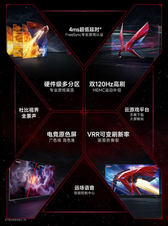 海信旗下的游戏电视,整体配置还算不错。海信ACE2支持65和75两个比较适合游戏的常规尺寸。峰值亮度达到了1000nit,同时65寸/75寸分别支持160区/220区分区控光,搭配95% DCI-P3的广色域屏幕,可以提供十分优秀的HDR效果。硬件方面支持A73四核1.4GHz和4G运存组合,可以确保电视流畅稳定运行。支持杜比视界和杜比全景声,配合60W大功率2.1声道扬声器单元,在家看电影、玩游戏都有不错体验。 配备全功能HDMI2.1接口,完美支持VRR和ALLM,同时配备有144Hz高刷,搭配各类游戏使用都有不错的使用体验。另外海信ACE2针对游戏体验专门做了延迟优化,输入延迟低至5.3ms。另外还设计有专门的游戏妙控台来提升游戏体验,轻松识别多种游戏主机,快速设置图像参数和智能优化游戏场景。海信ACE2整体配置均衡,除了游戏体验外也能满足各类日常观影体验,是台值得入手的电视。