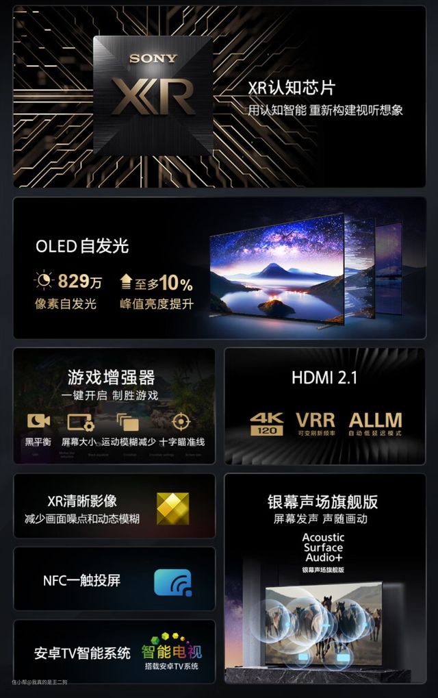 索尼目前主打走量的OLED型号,相比A95L系列价格更加亲民。产品整体的性能表现还是很出色的,索尼看家的XR认知芯片+XR OLED对比度增强 PRO+XR特丽魅彩PRO+XR OLED动态流畅+银幕声场旗舰版都有配备。峰值亮度达到了1000nit,配合索尼的XR芯片和专有技术的调教,整体画质表现出色。支持两组全功能HDMI2.1端口,支持VRR和ALLM,支持120Hz高刷,对主机游戏玩家十分友好。屏幕支持97% DCI-P3色域,拥有出色的HDR效果。尺寸方面支持OLED电视常见的55/65/77三个规格可选,其中无摄像头的版本还有更大的83寸可选。适合喜欢OLED电视或者高画质,同时预算也比较充裕的顾客。