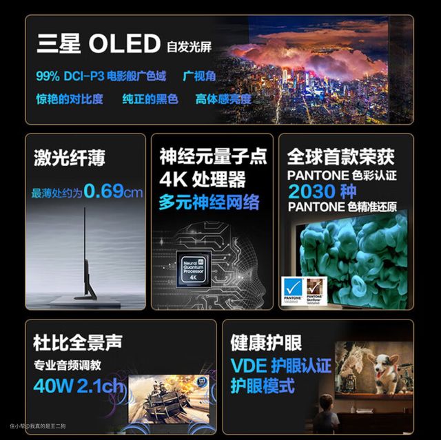 预算较为充裕的话,也可以看看三星的SZ90Z系列。这个系列采用了目前顶级的QD-OLED屏幕,整体画质表现可以说十分极致。峰值亮度达到了1400nit,基本是目前OLED电视的顶级水平。屏幕支持99.9% DCI-P3广色域屏幕,整体显示效果十分优秀。支持4个全功能HDMI2.1接口,轻松应对各类游戏和其他设备的接驳需求。支持144Hz高刷,配合游戏体验、运动场景和体育赛事都有流畅丝滑的体验。搭载有A72四核1.7GHz芯片+3G运存,可以确保系统流畅运行。新款Tizen智能电视系统延续了无开机广告的优秀传统,同时可以自行安装兼容的安卓APP,功能性和扩展性对比之前提升十分明显。三星SZ90Z整体表现十分出色,价格方面也只比普通的WOLED电视(区别与三星生产的QD-OLED屏,WOLED屏幕主要是LG在生产)稍贵,很适合预算相对充裕的高阶顾客选择。另外如果对内置扬声器有更高要求,或者喜欢金属支架和边框,那么可以考虑画质相同配置更高的三星SZ95Z系列。