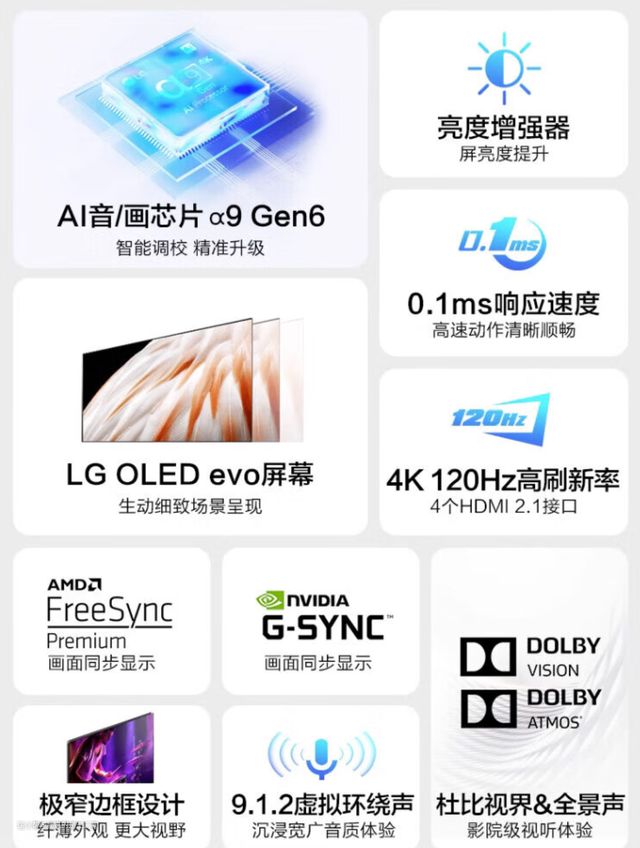 LG今年推出了C系列OLED电视的最新换代产品:C3。全系配备有优质的的EVO面板,芯片也升级到了最新放入α9 Gen6,喜欢OLED电视的小伙伴可以重点关注下这款产品。依旧支持四个满血的HMDI 2.1接口,支持G-SYNC和FreeSync,支持0.1ms超快相应速度,同时配备有HGIG游戏模式,顶级游戏电视的配置理应如此。另外LG C3支持杜比视界和杜比全景声,配合9.1.2虚拟环绕声系统,在家也能享受到顶级印花体验。尺寸方面有42/48/55/65/77/83可选,除了满足家庭电视观看的需求,42、48和55的小尺寸也很适合用作高端游戏显示器使用。需要注意的是LG依旧使用的自家封闭系统,整体的功能扩展性较为一般。整体来说C3的产品力没得说,就是价格稍微辣手了点,适合预算比较充裕的小伙伴。