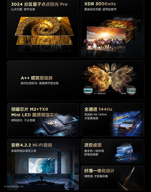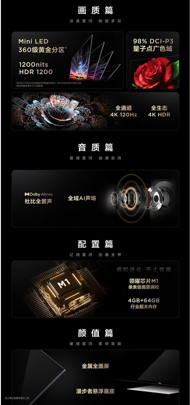 Q10H是TCL2023年推出的次旗舰系列(定位来说并不是去年Q10G的后续型号),也是线上的旗舰型号,整体的硬件堆料和配置可以说十分炸裂。我们来看看这台顶级Mini LED 液晶的奢华配置吧,3000nit峰值亮度+1080(65英寸)/1920(75英寸)/2304(85英寸)个分区控光+98% DCI-P3广色域屏幕+领曜芯片M2+A++广角超显屏,可以说堆料已经十分极致。采用了全新升级后的芯片,全功能HDMI2.1接口提升到2组。硬件采用A73四核1.4GHz芯片搭配4G+64G的存储组合,可以很好满足日常需要和战未来的需要。支持杜比视界和杜比全景声,配合2.1专业音响系统,居家也可以实现极佳的音画表现。新升级的灵控桌面和遥控器,可以实现方便快捷的操作和各类自定义功能,使用体验上会有更好表现。总的来说TCL Q10H这次是将堆料做到了极致,同时搭配不错的调教和优化,整个使用体验确实给力。想要一台高端电视,可以重点关注下Q10H系列。