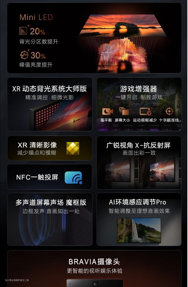 X95系列是索尼4K液晶旗舰,今年的X95EL对比去年的X95EK系列,尺寸方面涵盖了65、75和85三个主流规格,轻松匹配各类家庭需求。延续了MiniLED配置,同时在控光分区数量和峰值亮度表现均有提升。控光分区数量提升到720(65英寸)/720(75英寸)/864(85英寸)个,峰值亮度提升到1500nit,配合96% DCI-P3高色域屏幕可以提供十分出色的HDR效果和观音体验。核心技术方面搭载了XR认知芯片,配合优化整体观看体验。硬件方面采用了四核A73 1.8GHz+4G运存的高配置,系统流畅运行无压力。X95EL也是支持2组HDMI 2.1全功能接口的机型,同时支持ALLM和VRR,输入延迟18ms,方便搭配PS5这类主机游戏使用。同时X95EL搭载广锐视角和X抗反射屏,提升观看体验。X95EL整体的堆料和优化都还是比较不错的,不过售价上也不算便宜,适合对画质要求较高同时预算相对充裕的小伙伴。