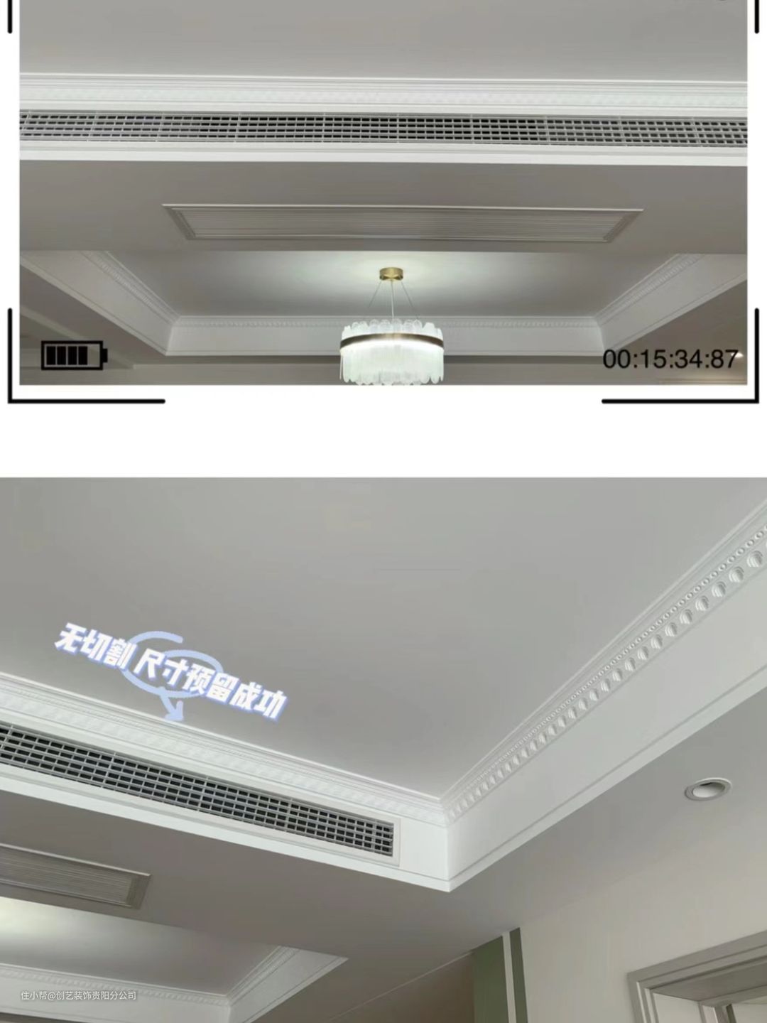 💡拉高双眼皮吊顶颜值的那圈石膏线,这里要注意啦,安装中央空调新风系统的一定要注意,出风口避免和石膏线“打架”,预先把尺寸的问题考虑进去,以免在贴石膏线的时候出现切割或压根安装不了的情况。