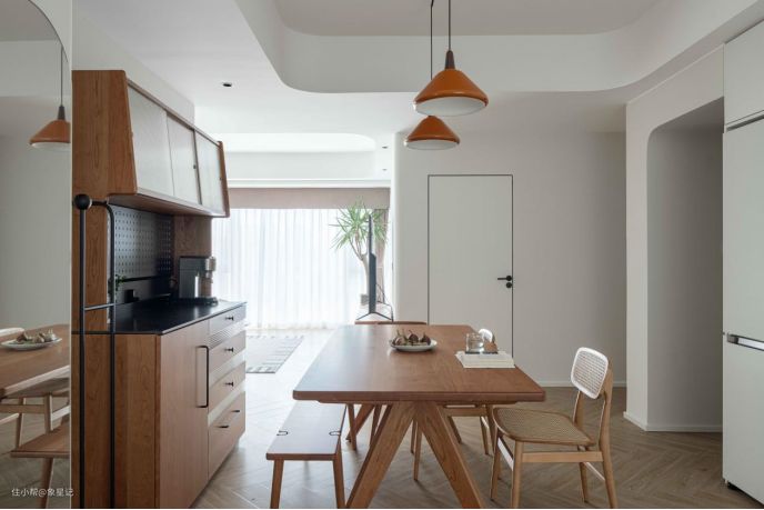 ⭕为与餐厅收纳柜保持齐平,设计师在厨房门造型上做了半拱门造型元素,整屋适配度💯